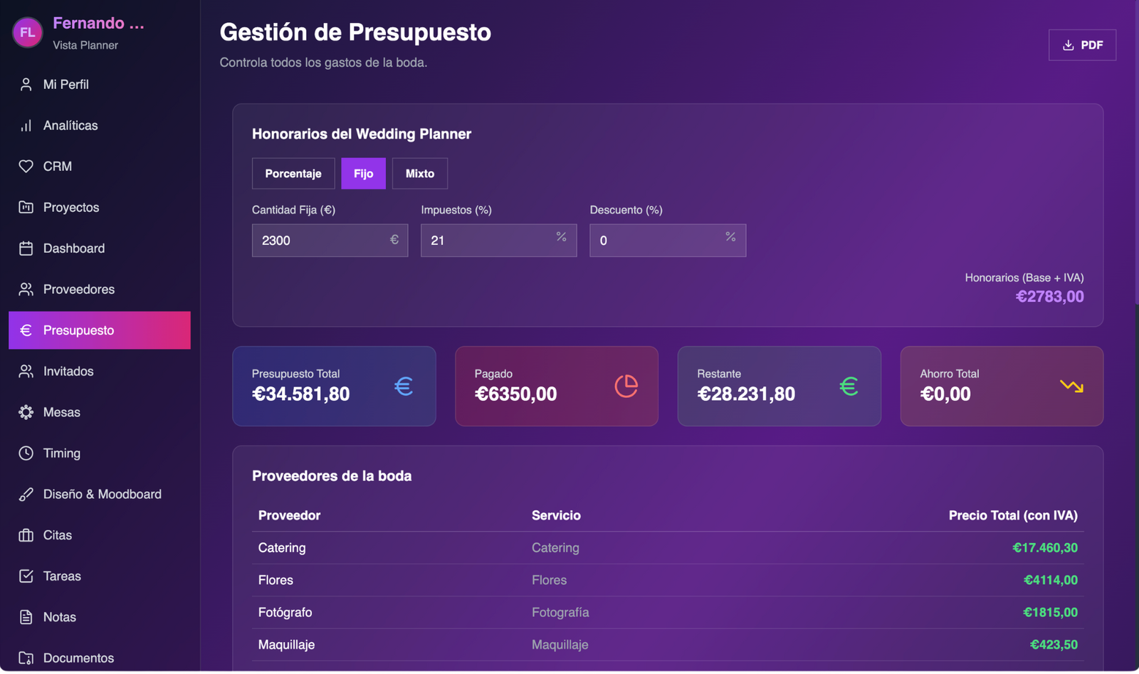 Registra y gestiona proveedores específicos para tu boda, incluyendo tarifas, notas y contratos. Mantén organizados los datos relevantes de cada profesional para coordinar fácilmente a quienes trabajarán en él.