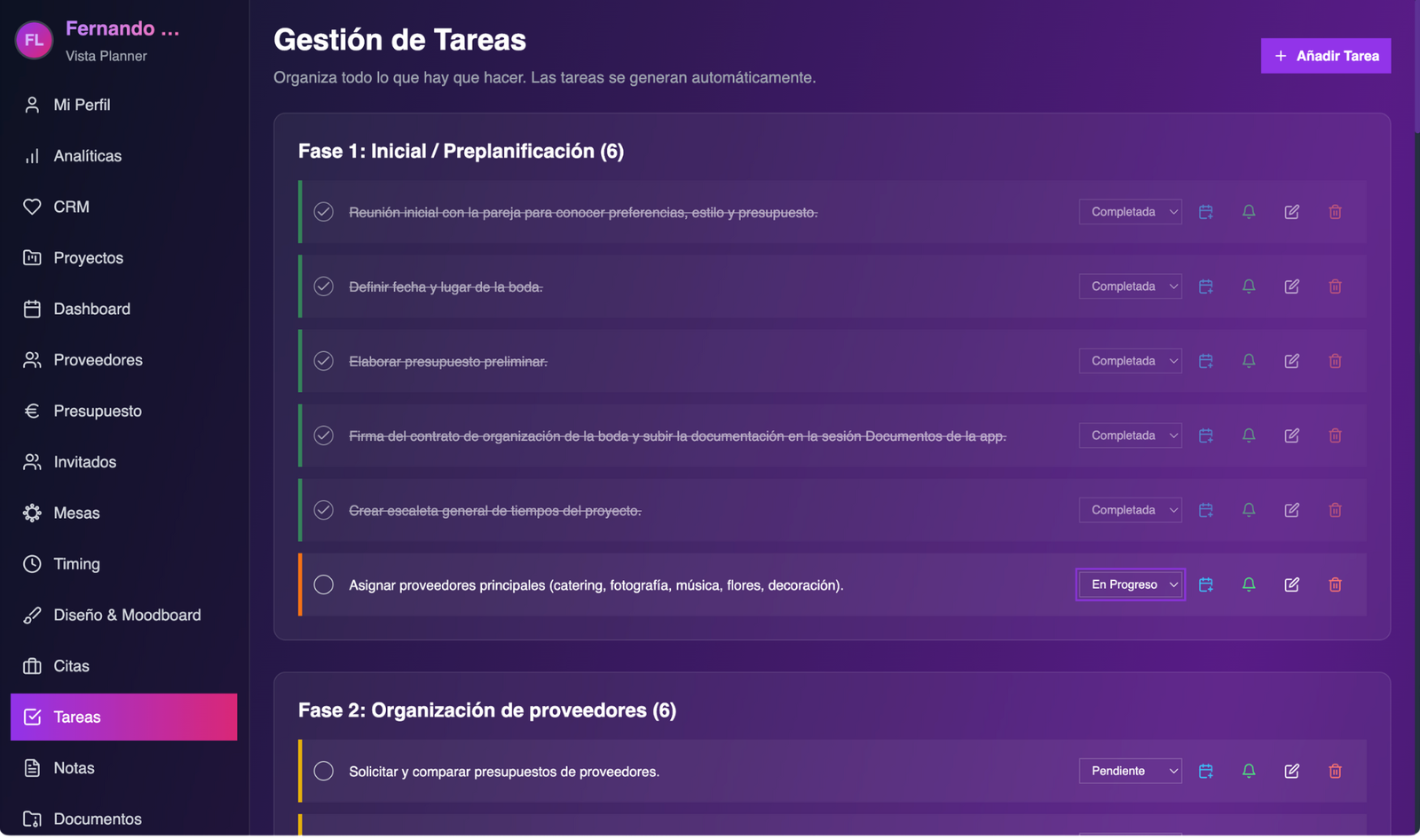 Administra tu boda desde un panel único que centraliza toda la información relevante: tareas, documentos, presupuesto, proveedores y más. Mantén el control total sin importar cuántas cosas tengas en marcha.